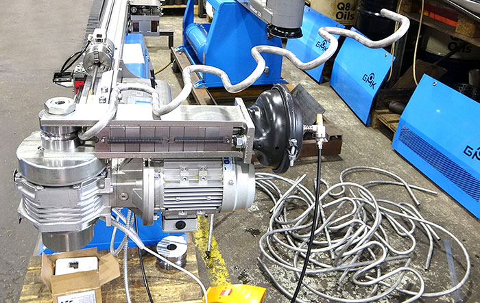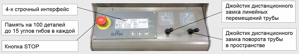 Пневматическая система дистанционного управления замками фиксаторов имеет раздельное (джойстиковое) управление для фиксаторов линейных перемещений трубы в точки начала очередных гибов и для фиксаторов поворота трубы в пространстве.